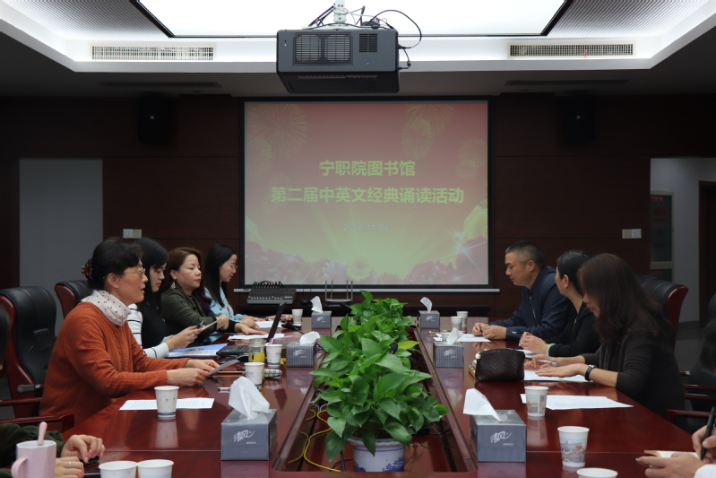 为了跟进学校国际化发展的办学理念,激发馆员学习英语的积极性,继续推进巾帼文明岗创建工作,积极响应国家对全民阅读活动的号召,2018年11月6日下午,宁波职业技术学院图书馆举办了“诵读经典 传承文明”第二届中英文诵读活动,此次活动得到了全体馆员的积极响应,全馆共20名正式员工中有14位馆员报名参加该活动,占总人数的70%,其中英文诵读馆员8人,占总诵读人数的57%。此次由学院工会副主席任锋和国际学院外语老师李清辉等四人担任评委。