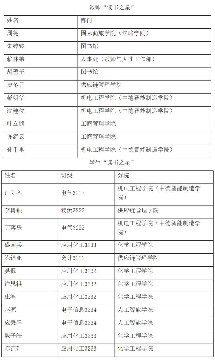 为表彰爱读书、读好书的师生读者,图书馆以2023学年全体读者借阅册数、进馆次数作为依据,评选出周尧等前十名教师读者、卢立齐等前十二名学生读者进行表彰和奖励。