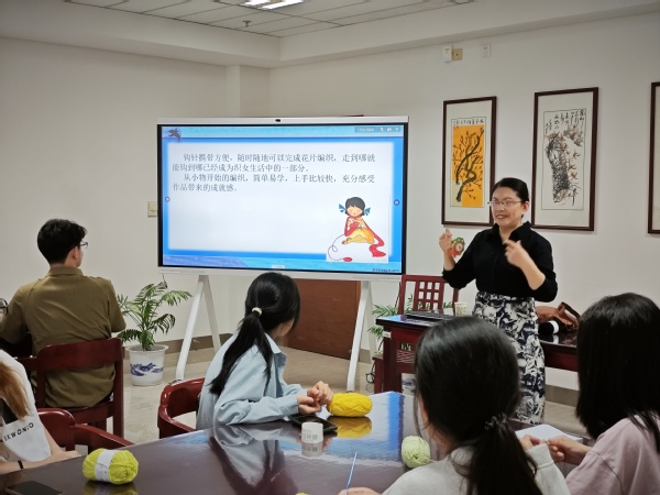 活动伊始,何老师为大家讲解香包的历史渊源和文化意义,钩针编织工艺的起源和发展和风靡世界的例子,“钩针编织只有你想不到,没有做不到,我们的香囊是用两片式钩针编织花瓣缝合而成,花瓣的内容可以充分发挥大家的想象力,花鸟鱼虫,几何图案都是不错的选择!