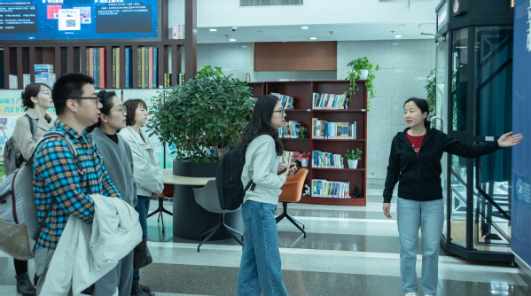 交流伊始,办公室主任周燕老师带领来访团队实地参观了图书馆大厅及学习协作中心,详细介绍了我馆“区校共建”的特色合作模式。同时分享了我馆在阅读推广品牌打造、信息素养教育体系构建、沉浸式阅读活动创新等方面的实践成果,生动展现了以读者为中心的服务理念与育人成效。